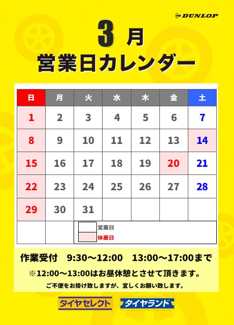 2026年3月の店休日のご案内です こんにちは! タイヤランド田原本です 来月、3月の休業日のご案内をさせていただきます。 第二土曜日の14日、祝日の20日(金)が休業日となりますのでご注意ください。 3月もタイヤランド田原本をよろしくお願いいたします。 2026.02.28