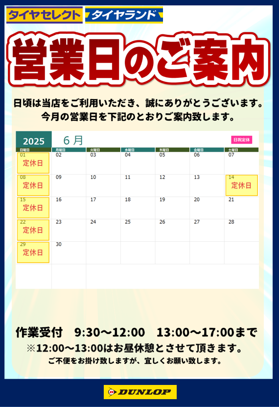 こんにちは! タイヤランド田原本です! 今月も沢山のご来店本当にありがとうございました。 早速ではございますが6月の営業日のご案内をさせて頂きます。 ご来店の際は参考にしてください!