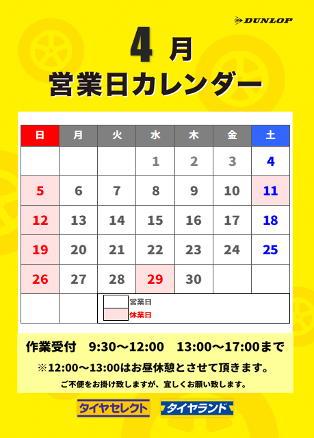 こんにちは!タイヤランド田原本です!! 4月の定休日のご案内をさせていただきます 第二土曜日は休業日とさせていただいておりますのでご注意ください・・。 4月もタイヤランド田原本をよろしくお願...