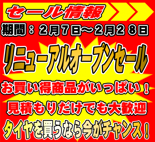 リニューアルオープンセールを開催します! 期間中タイヤが通常表示価格より25%OFF! (シンクロウェザー、SPORT MAXX LUXは除く) IMS(タイヤパンク応急修理 キット)を同時購入でタイヤをさらに10%OFFとなります...