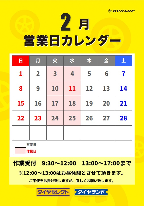 平素はタイヤセレクト伊丹をご利用いただき、誠にありがとうございます。 誠に勝手ながら、2026年1月24日(土)は社内研修のため、終日臨時休業とさせていただきます。 翌1月25日(日)からは通常通り営業いたします。 お...