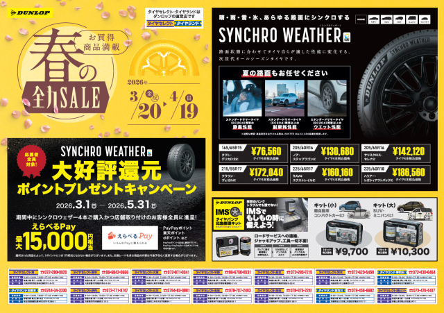 リニューアルオープンセール、開催から1週間が経ちました。 まだまだ寒い日が続きますがお体にはお気を付けください! 期間中タイヤが通常表示価格より25%OFF! (シンクロウェザー、SPORT MAXX LUXは除く) IMS(タ...