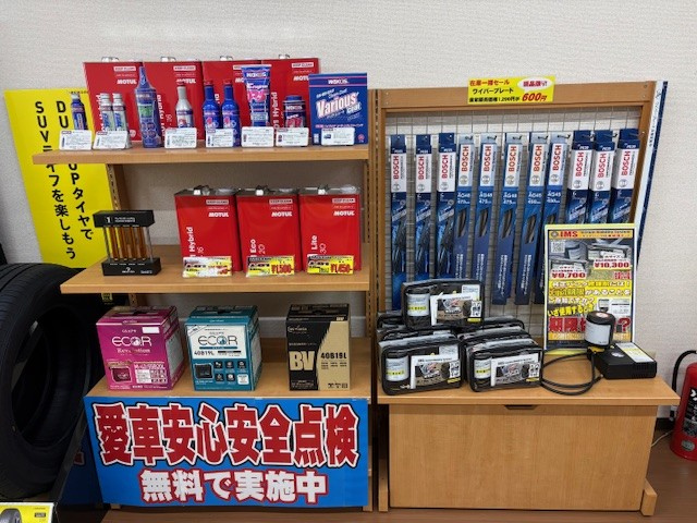 タイヤ以外にもエンジンオイル、ワイパー、バッテリーも取り扱っています。