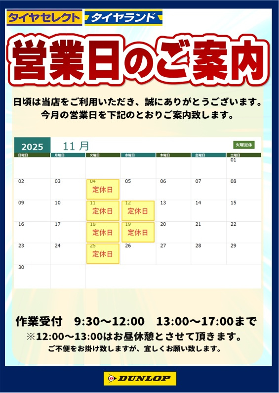 いつも当店をご利用いただき誠に有難う御座います。 11月の営業日のご案内になります。