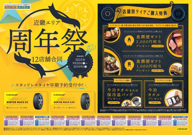 9月20日より数年ぶりに『周年祭』を開催します! タイヤがお得にご購入いただける期間となっております。 さらにタイヤの種類に合わせて【食撰便グルメギフト】を先着でプレゼント! 詳しくは【チラシ・クーポン】のペ...