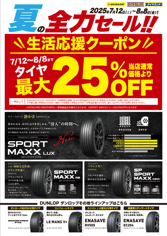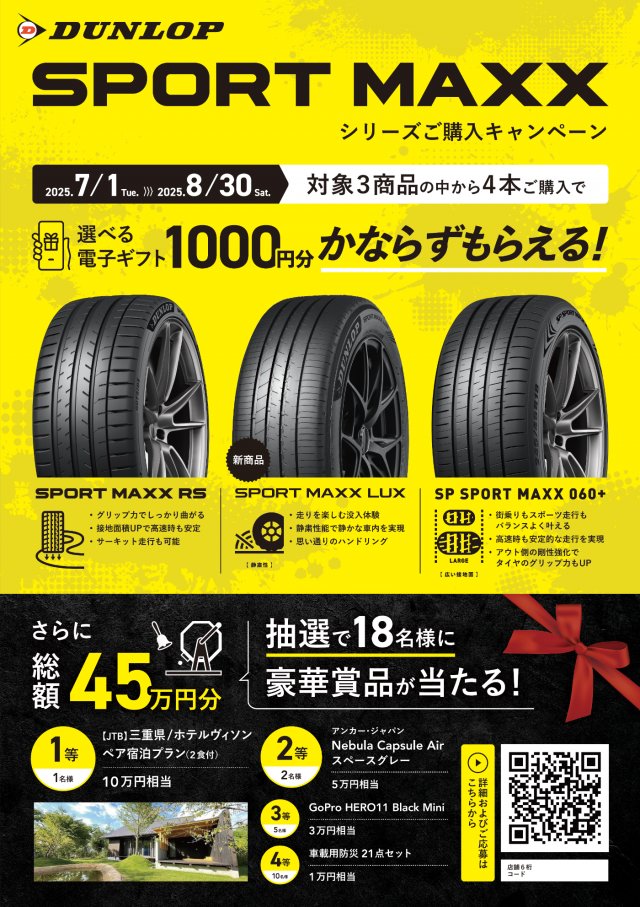 本日で7月も終了です。『夏の全力セール』も残り僅かとなりました。 タイヤが当店通常価格より25%OFF!(シンクロウェザー、特価タイヤ除く) さらに【SPORT MAXX】シリーズ4本お買い上げの方全員に選べる電子ギフト10...