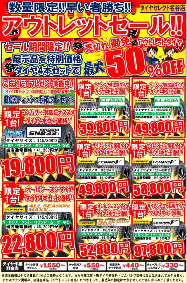 お得なアウトレットタイヤを最大50%OFFにて販売中!!