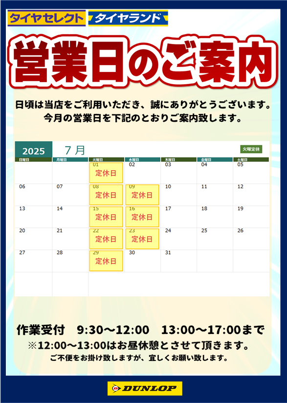 日に日に暑さも増してきて、皆様いかがお過ごしでしょうか? 7月の定休日のお知らせになります。 水分補給はこまめに!元気に夏を乗り切りましょう!!