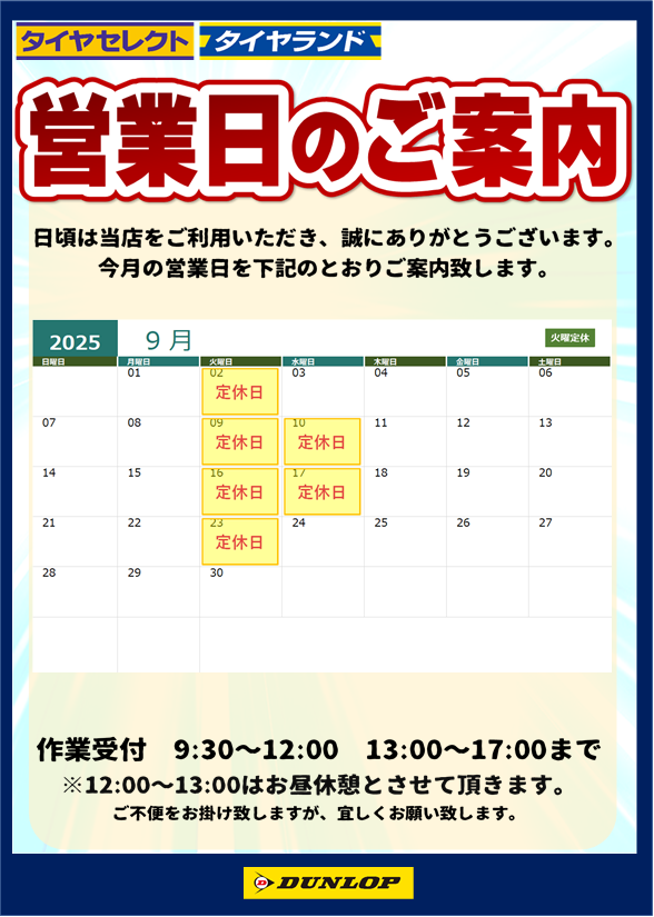 今月の定休日のご案内です。 ご不便おかけしますが、よろしくお願いします。