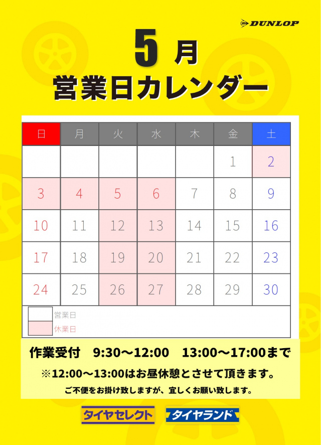 4月の営業日カレンダーとなります。 毎週火曜日・水曜日が定休日となります。 また、3月20日から開催中!! 近畿圏内タイヤセレクト・タイヤランド合同開催『春の全力セール』 4月19日までの開催となっております、...