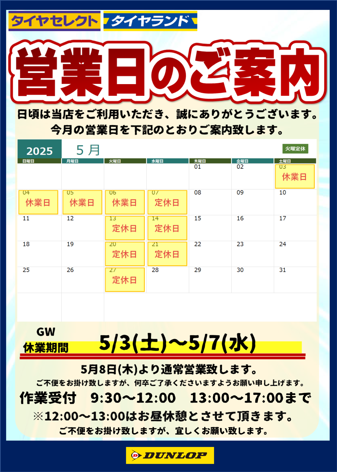 また、ゴールデンウィーク一斉休業の為『5月3日(土)~5月7日(水)の5日間』