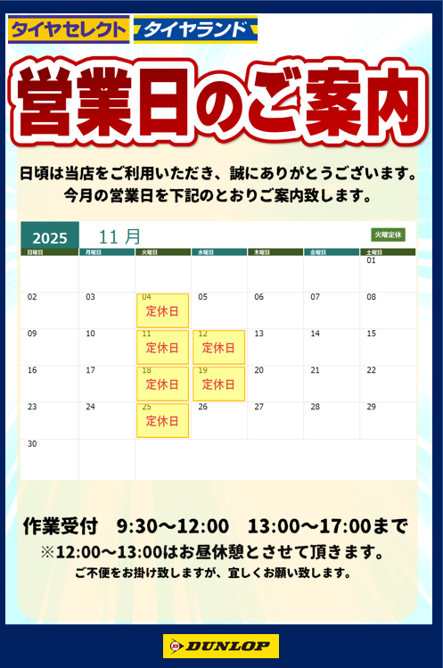 11月の営業日カレンダーとなります。 毎週火曜日・12日・19日の水曜が定休日となります。 ご迷惑をおかけしますがよろしくお願い致します。