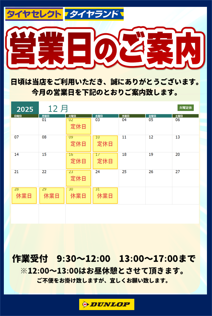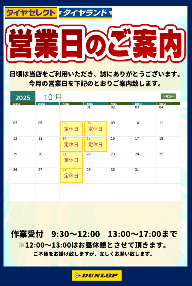 9:30-12:00/13:00-17:30(12:00-13:00お昼休みになります。作業受付17:00まで)