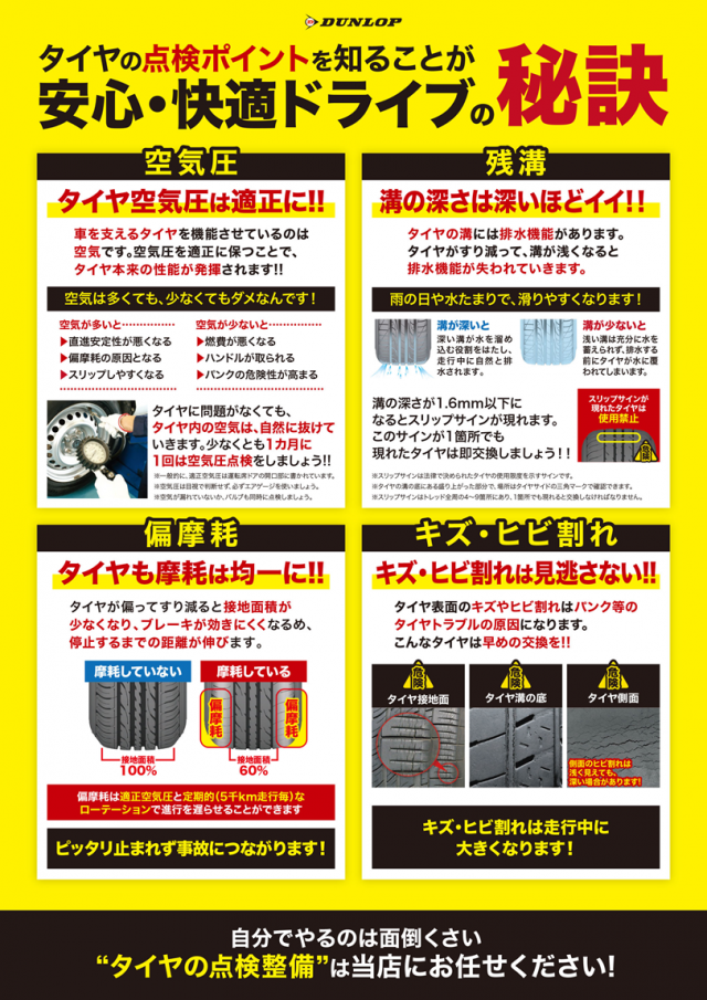 そして当店でも無償で空気圧点検と併せて、スペアタイヤ・パンク応急修理キットの点検も承りますので、気軽に申しつけ下さい。