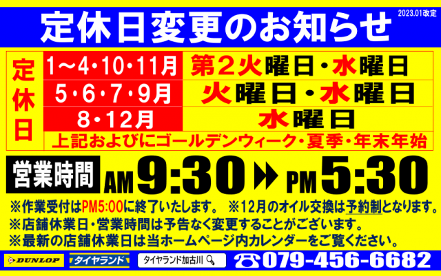 10月の定休日のお知らせ 平素よりタイヤランド加古川をご利用いただき、ありがとうございます。 9月は毎週水曜日と第二火曜日の 4・10・11・18・25日を 定休日とさせていただきます。 9日(月・祝)は営業いたします。 ご来店、お待ちしております。 2023.10.03