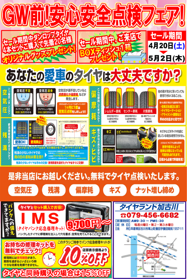 大型連休中に安心してお出かけして頂けるよう、空気圧やタイヤの状態を点検させて頂くという内容になっています。
