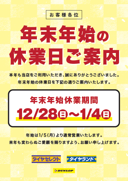 かなり変則的な営業日となっていますので、新年明けてから点検等でご来店の予定がある方は、何卒お気をつけください。