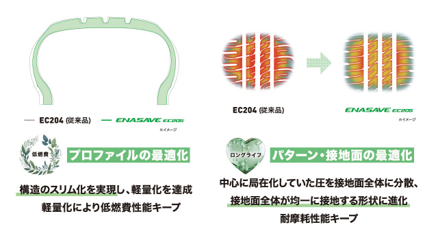 そして構造・パターン、接地面の最適化によりEC204よりご好評頂いている低燃費性能とロングライフ性能はキープ。