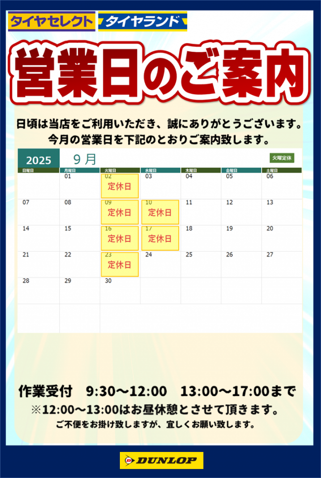 平素よりタイヤランド加古川をご利用いただき、ありがとうございます。 表題の件なのですが、9月の休業日は 「9月30日を除く」毎週火曜日と10日・17日(各水曜日) が定休日になっています。 陽射しは相変わらず強烈で、...
