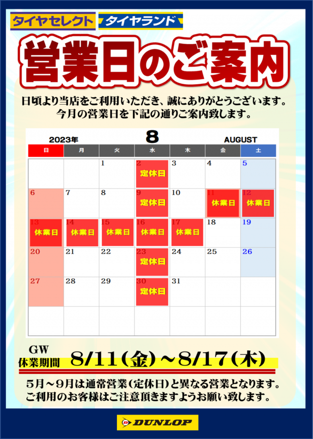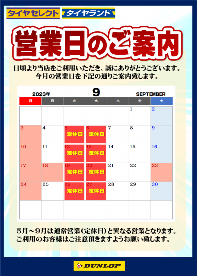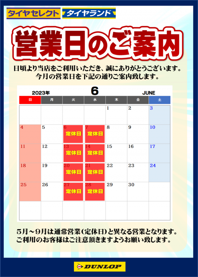 緊急事態宣言の解除が発表されたことを受け、当該エリアのタイヤセレクト・タイヤランド(直営店)におきましては、順次、通常営業を再開いたします。 お客様及び従業員の安全を第一に考え、予約制の導入や接客時間の短縮をはかることで、お客様同士の距離の確保や、スタッフとの接触機会を最小限に心がけるなどの感染防止に努めてまいります。 (店内には消毒液を設置しております。また換気、テーブル等の消毒も実施しております。) 詳細は「 お知らせ」をご確認ください。 ご不便やご迷惑をおかけいたしますが、何卒宜しくお願い申し上げます。