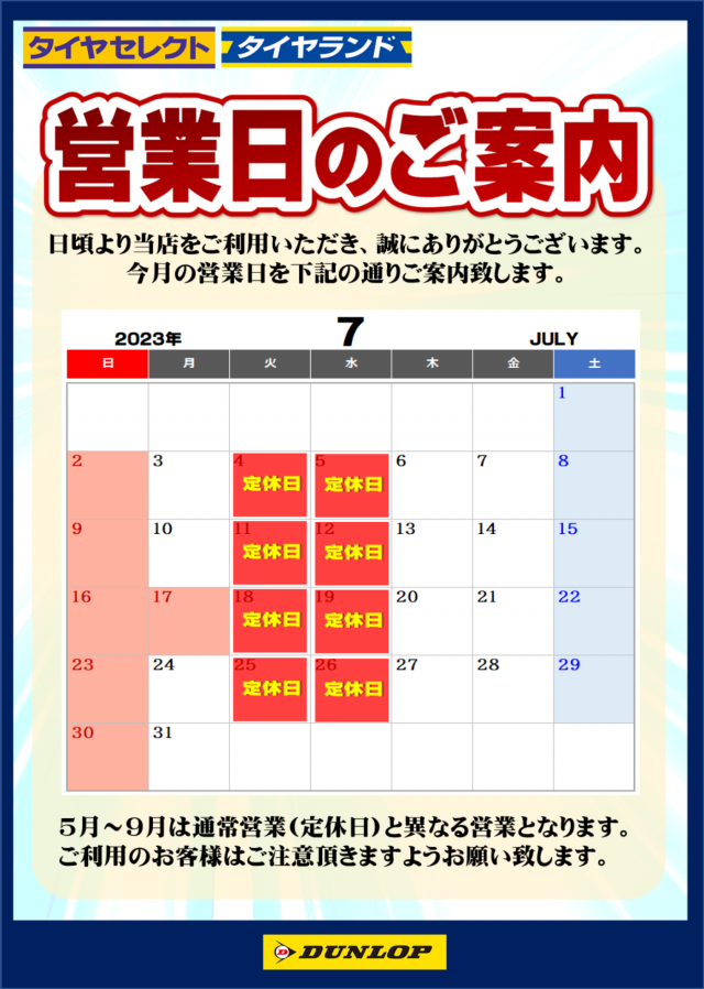5月から9月まで下記の日程で営業いたします。 皆様にはご迷惑をおかけしますが何卒ご協力お願い致します。
