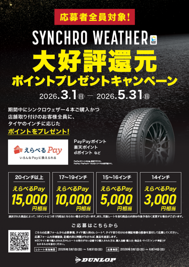 いつもタイヤランド姫路のホームページをご覧いただきありがとうございます。 2026年3月1日(日)~2026年5月31日(日)の期間中にシンクロウェザー4本購入かつ 店舗取付のお客様全員にタイヤサイズに応じたポイ...