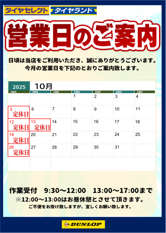 いつも当店をご利用いただき誠に有難う御座います。 10月の営業日のご案内になります。