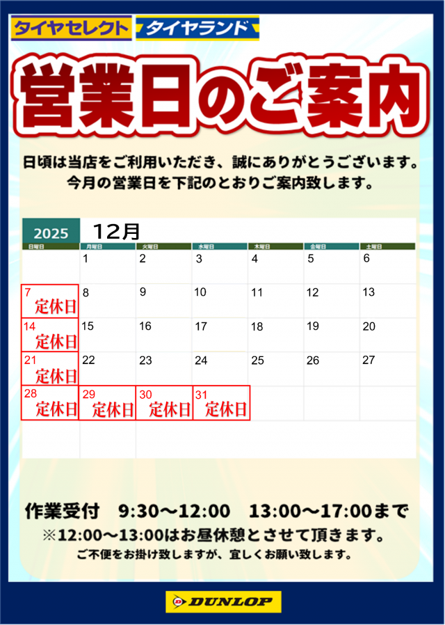 緊急事態宣言の解除が発表されたことを受け、当該エリアのタイヤセレクト・タイヤランド(直営店)におきましては、順次、通常営業を再開いたします。 お客様及び従業員の安全を第一に考え、予約制の導入や接客時間の短縮をはかることで、お客様同士の距離の確保や、スタッフとの接触機会を最小限に心がけるなどの感染防止に努めてまいります。 (店内には消毒液を設置しております。また換気、テーブル等の消毒も実施しております。) 詳細は「 お知らせ」をご確認ください。 ご不便やご迷惑をおかけいたしますが、何卒宜しくお願い申し上げます。