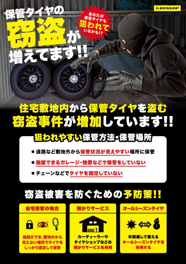 いつもタイヤセレクト豊中店のご利用ありがとうございます(^^) 本日は自宅等で保管しているタイヤの盗難についてのお話です♪ 近年住宅敷地内から、保管タイヤを盗む窃盗事件が増加しています。 狙われやすい保管方法。...