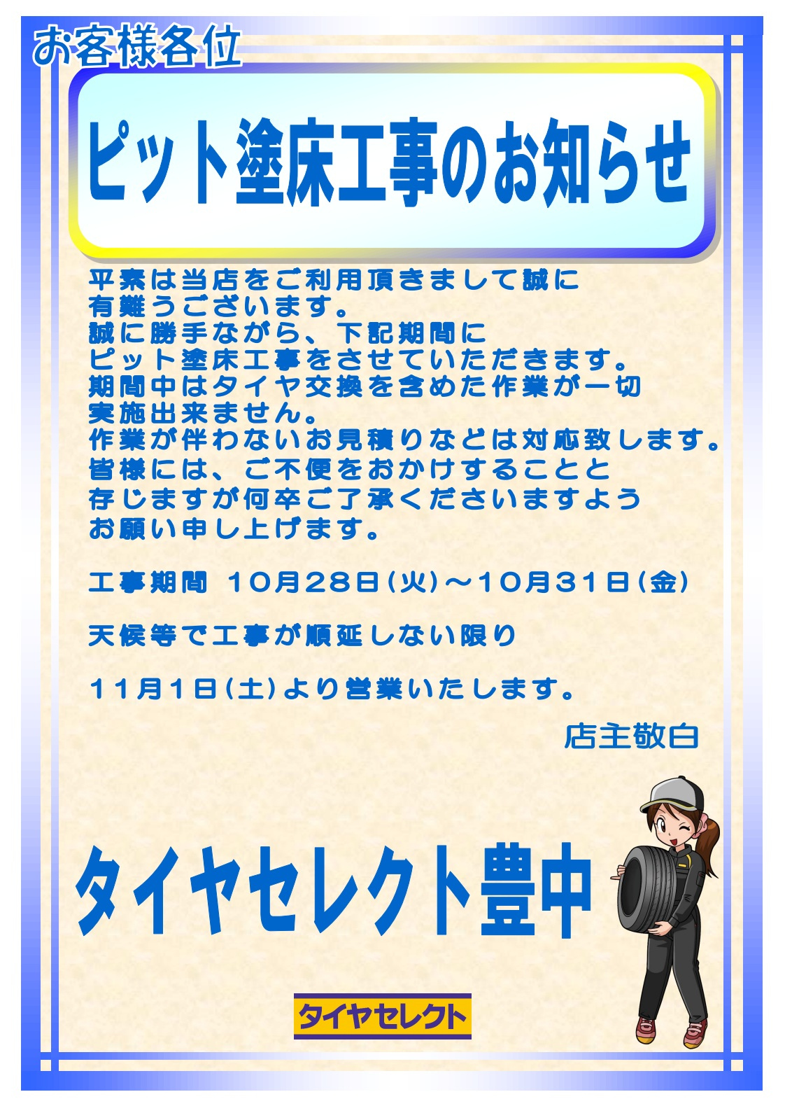 重要なお知らせ!!ピット床工事のご案内♬ いつもタイヤセレクト豊中店をご利用いただき有り難うございます♪ 明日、10月28日~10月31日までの期間に ピット塗床工事を実施致します。 期間中はタイヤ交換を含めた作業が一切できません。 作業を伴わないお見積りなどは対応致します。 皆様には、ご不便をおかけすることと存じますが 何卒ご了承くださいますようお願い申し上げます。 工事期間:2025年10月28日(火)~10月31日(金) 天候等で工事が順延しない限り 2025年11月1日(土)より、営業致します。 2025.10.27