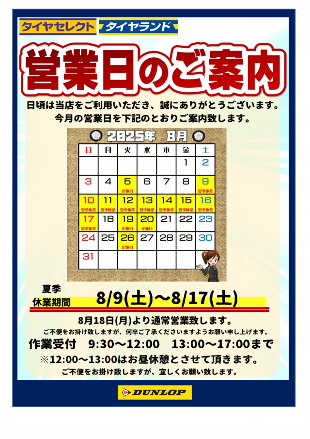いつもタイヤセレクト豊中店をご利用有り難うございます♪ お盆期間の夏季休業日を掲載しております。 8月18日(月)より通常営業致します。 お間違えのないようご来店お待ちしております♬