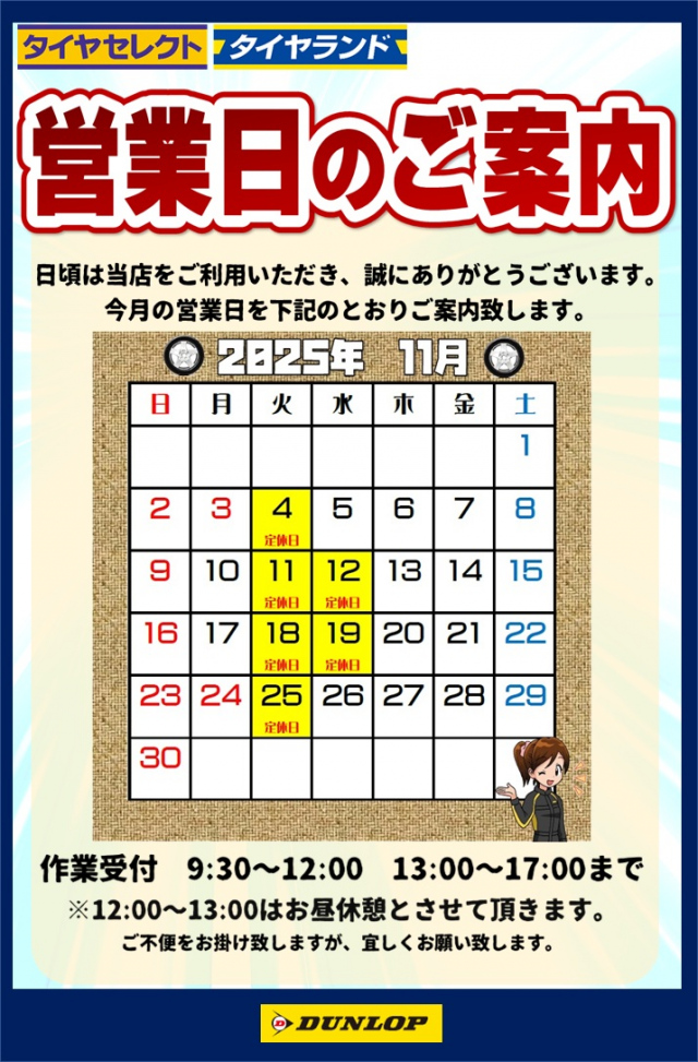 いつもタイヤセレクト豊中店をご利用いただき有り難うございます♪ 10月28日~10月31日までの期間に ピット塗床工事を実施致しております。 期間中はタイヤ交換を含めた作業が一切できません。 作業を伴わないお見積り...