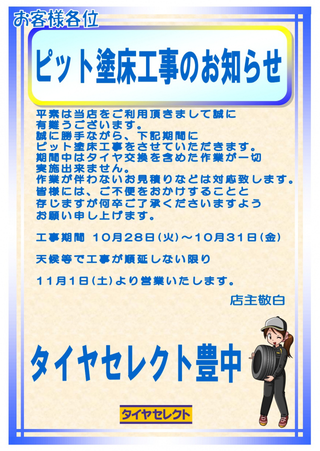 いつもタイヤセレクト豊中店をご利用いただき有り難うございます♪ 明日、10月28日~10月31日までの期間に ピット塗床工事を実施致します。 期間中はタイヤ交換を含めた作業が一切できません。 作業を伴わないお見積り...
