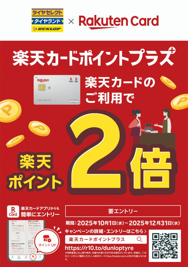 いつもタイヤセレクト豊中店をご利用有り難うございます♪ タイヤセレクト豊中では 楽天カード ポイントプラスキャンペーン実施中! お得なチャンスをお見逃しなく! 2025年10月1日から12月31日まで、 楽天カードをご利...