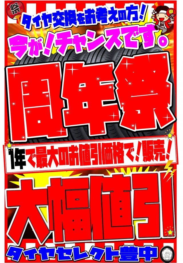 いつもタイヤセレクト豊中店のご利用ありがとうございます(^^) タイヤセレクト豊中では 年に1度のお祭セール【周年祭】を開催中です。 セール期間は本日が最終日になります♪ 秋の行楽シーズン前にタイヤ交換は如何でし...