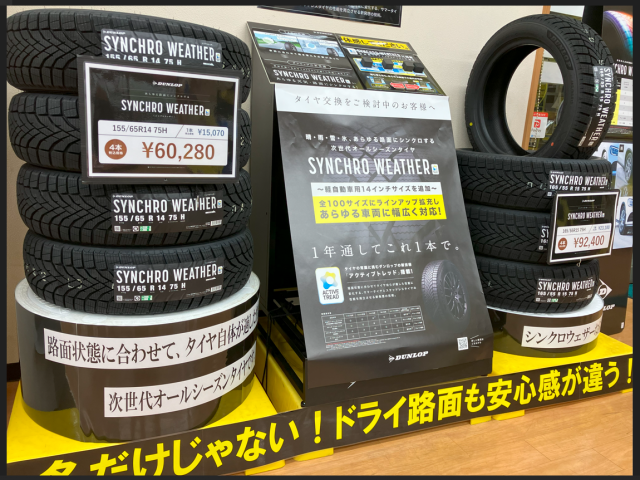 ホームページにアクセス、ありがとうございます。 155/65R14・165/55R15 軽自動車サイズのシンクロウェザーが発売されております! オールシーズンタイヤでタイヤ交換をご検討の方は、 お気軽にタイヤ...