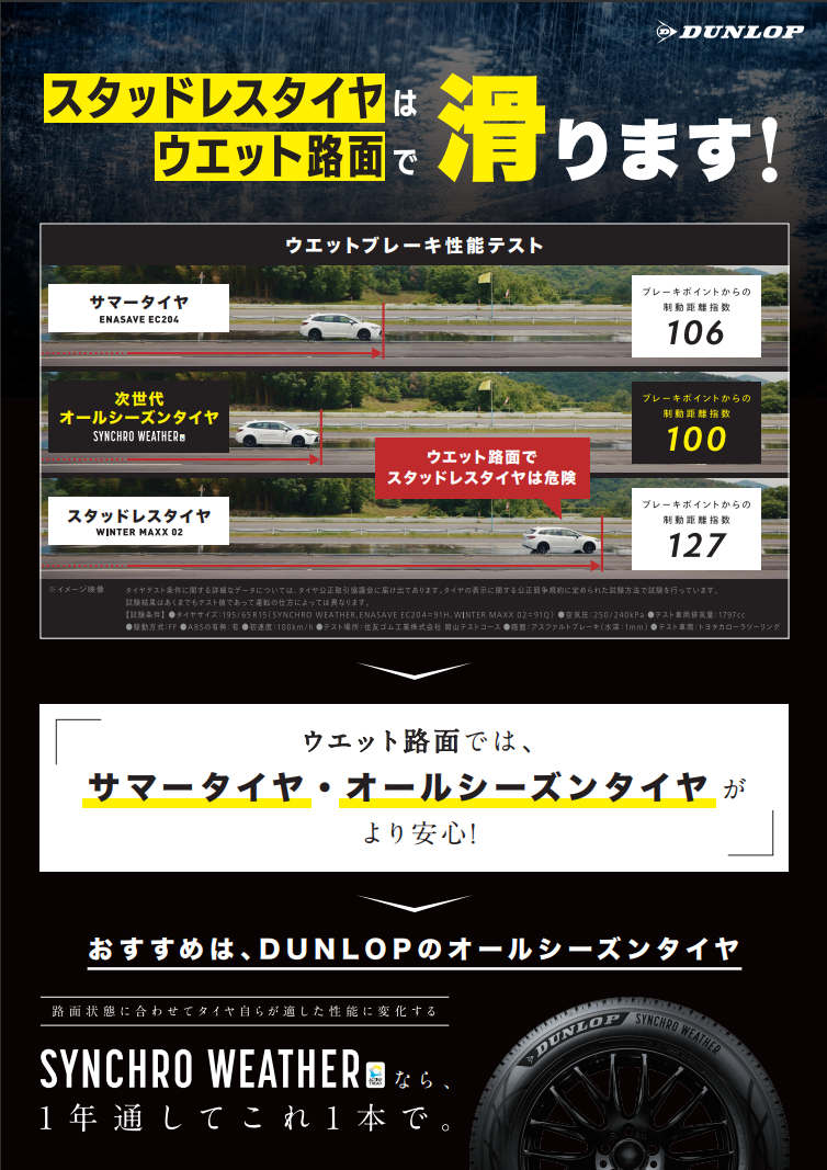 ダンロップの次世代オールシーズンタイヤ シンクロウェザーならあらゆる路面に合わせて自ら適した性能に変化します!!