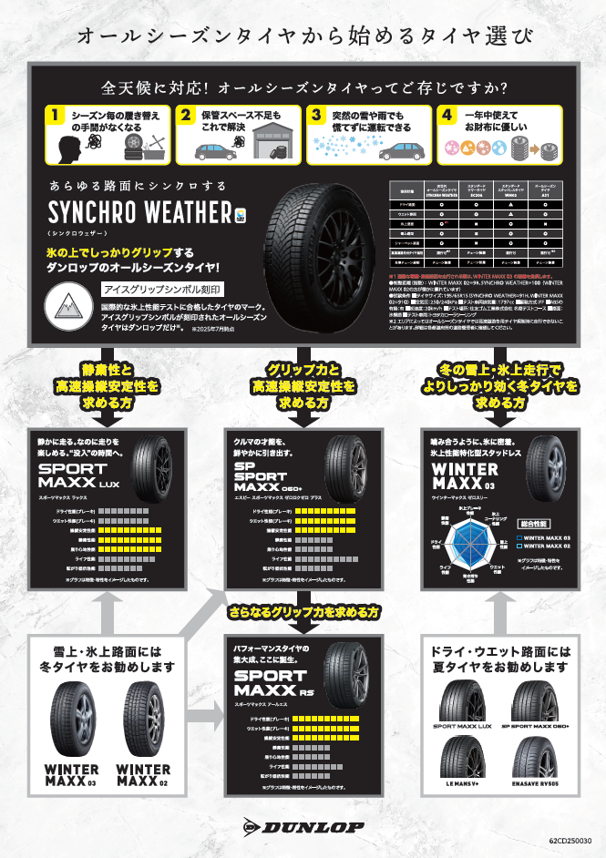 シンクロウェザー大好評発売中! 軽自動車用14インチサイズ入荷しております! 雨の日も安心、ダンロップのオールシーズンタイヤ『シンクロウェザー』 もちろんタイヤ無料点検も実施中です! お気軽にご相談ください! 2026.02.12