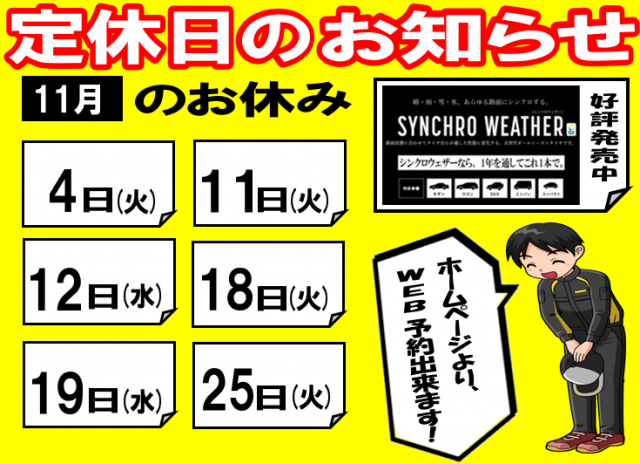 11月の定休日のお知らせです。 11月3日(月)文化の日と11月24日(月)振替休日は当店通常営業日となっております☆ オールシーズンタイヤからスタッドレスタイヤ、もちろん夏タイヤも店頭展示しています! たくさんのご来...