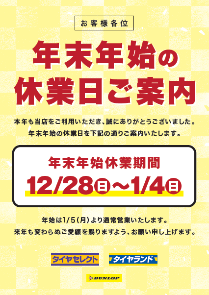 年末年始休業日のご案内です。 12月28日(日)~1月4日(日)が年末年始休業期間となります。 年始は1月5日(月)より通常営業いたします。 本年も営業日が残り3日間となりました!年末年始お出かけ前にぜひ一度ご来店くださ...