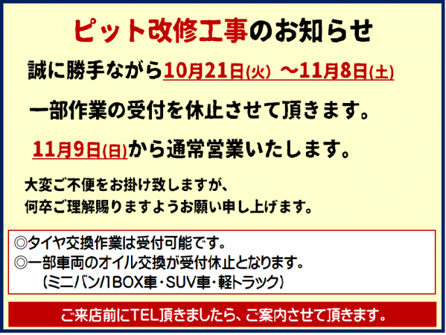 タイヤセレクト平野のホームページに アクセス有難うございます! 10月21日(火)-11月8日(土)の期間 ピットの改修工事実施に伴い、 一部作業の受付が休止となります、 当店ご利用のお客様には 大変ご迷惑お掛け致します...