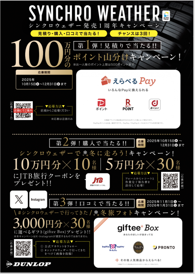 タイヤセレクト平野のホームページに アクセス有難うございます! 本日は10月15日より開始のキャンペーンのご案内です! 昨年の10月に発売以来大好評の次世代オールシーズンタイヤ 「SYNCHRO WEATHER」が発売1周年...