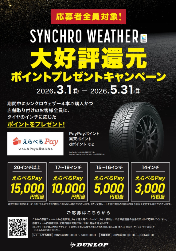 条件:期間中にシンクロウェザー4本購入かつ店舗取り付け