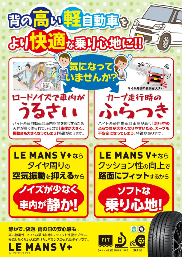 軽自動車へおすすめ商品! 軽自動車へおすすめ商品のご案内になります。 ご存じの方もいらっしゃると思いますが サイレントコア搭載のルマンV+のご紹介です♬ ノイズが少なく車内も静かで快適♬ クッション性の向上でソフトな乗り心地♪ コンフォートタイヤ DUNLOP「LE MANS V+」 サイレントコア搭載コンフォートタイヤです。 タイヤをお求めの方、是非当店をご利用下さい♪ 2026.03.29