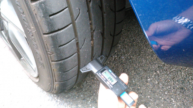 ワタクシのロードスターのタイヤで2年落ち、溝の残りが4mm弱、新品平均が8mmで使用限度が1.6mmなので、今まで使用してきたのが4mm、使用限度まで2.4mmという状態です。