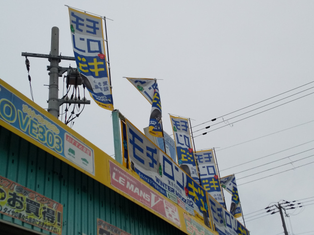 風が強い日が続いたので、タイヤ展示をしているシャッターラックの屋根にあるノボリがかわいそうなことになってます。