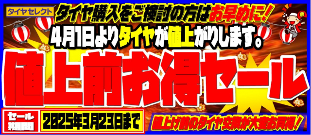 当店の、ホームページをご覧いただきありがとうございます。 本日より冬の全力セール開催です! 開催期間は11月22日(土)から12月21日(日)まで 夏タイヤはもちろん冬タイヤをお買得価格にてご提供! オールシーズン...