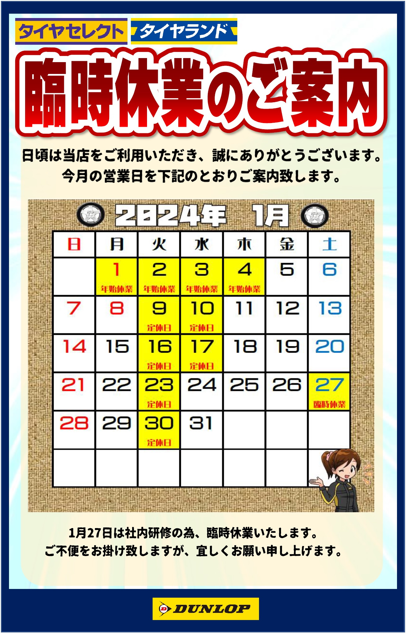 本日1月27日は社内研修の為、臨時休業いたします。