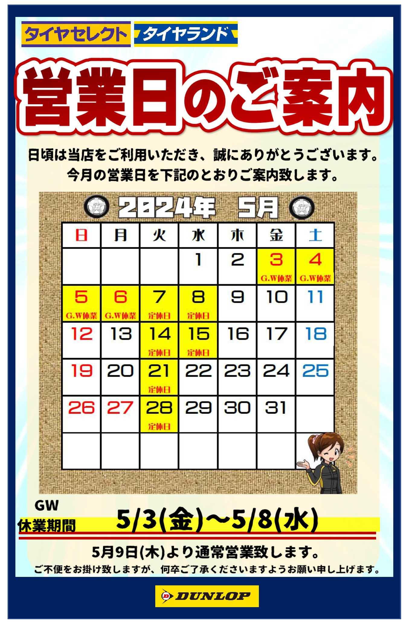 定休日のご案内♬ いつもタイヤセレクト泉北店をご利用有り難うございます♪ 今月の定休日を掲載しております。 ゴールデンウィーク期間中の休みも有りますので お間違えの無いようご来店お待ちしております♬ 2024.05.01