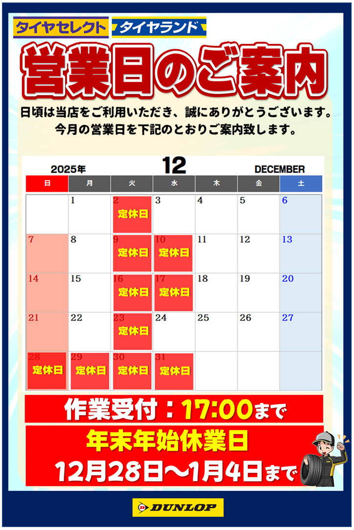 11月はたくさんのご来店ありがとうございました☆ 12月の定休日のご案内です。 ご不便お掛けしますが何卒ご理解を 賜りますようお願い申し上げます。